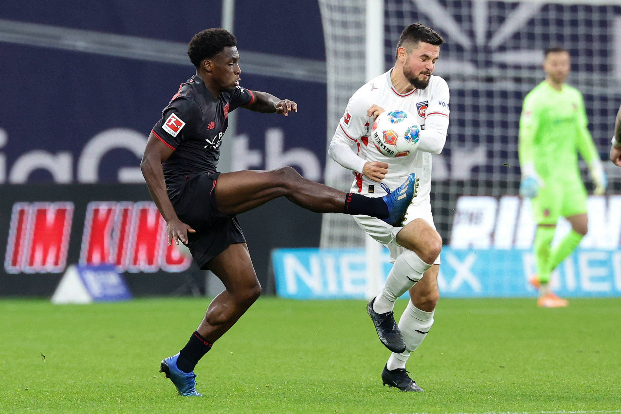 เมื่อวันที่ 8 พฤศจิกายน กริมัลโด้ของไบเออร์ เลเวอร์คูเซ่น (ซ้าย) และชิวิชวาดเซของไฮเดนไฮม์ (ขวา) แย่งชิงการครองบอลระหว่างการแข่งขัน สำนักข่าวซินหัว (ภาพโดย Joachim Bivarez)
