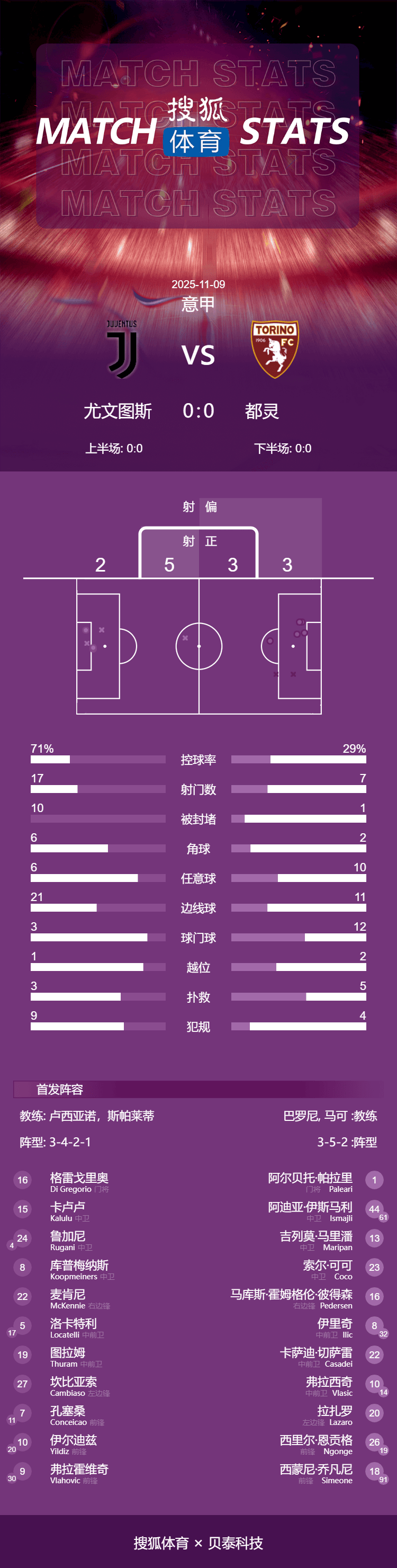 เวลา 01:00 น. ตามเวลาปักกิ่ง วันที่ 9 พฤศจิกายน 2025 การแข่งขันกัลโช่ เซเรีย อา นัดที่ 11 ได้เริ่มขึ้นที่สนามอัลลิอันซ์ สเตเดียม โดยยูเวนตุสเป็นเจ้าบ้านพบกับโตริโน่ ในครึ่งแรก ทั้งสองทีมมีโอกาสยิงเข้ากรอบแต่บอลไปชนเสาและคานประตู ทำให้ยังไม่มีทีมใดทำประตูได้ ครึ่งหลังยังคงเป็นเกมแลกกันอย่างต่อเนื่อง แต่ทั้งสองทีมก็ยังไม่สามารถเจาะตาข่ายได้ จบเกม ยูเวนตุสและโตริโน่เสมอกันไปแบบไร้สกอร์ 0-0