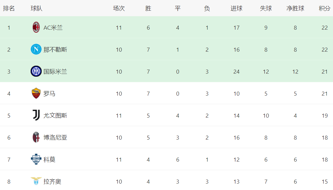 ในตารางลีก เอซี มิลาน ได้ขึ้นสู่อันดับสูงสุดแล้ว ด้วยคะแนน 22 คะแนน พวกเขาเสมอกับนาโปลีในคะแนน แต่มีประตูได้เสียที่ดีกว่า ทำให้ครองอันดับหนึ่งได้ อย่างไรก็ตาม เนื่องจากพวกเขาลงเล่นมากกว่านาโปลีหนึ่งนัด พวกเขาอาจถูกแทนที่ได้ในเวลาใดก็ได้อินเตอร์ มิลาน อยู่ในอันดับที่สามด้วยคะแนน 21 คะแนน โรม่า ก็มีคะแนน 21 คะแนนเช่นกัน อยู่ในอันดับที่สี่ ยูเวนตุส อยู่ในอันดับที่ห้าด้วยคะแนน 19 คะแนน โบโลญญา และ โคโม ต่างมีคะแนน 18 คะแนน อยู่ในอันดับที่หกและเจ็ดตามลำดับ