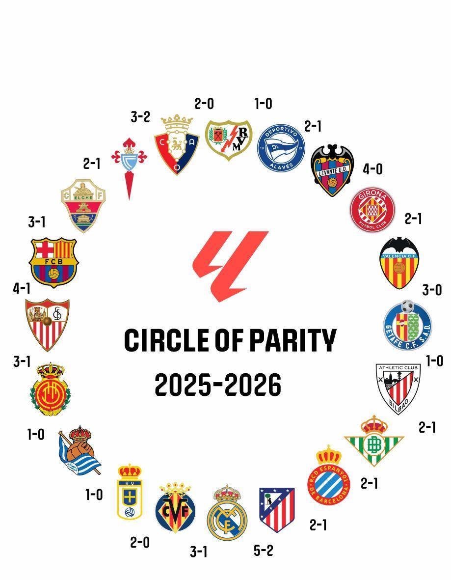 อย่ากังวลหากทีมของคุณแพ้ – นี่อาจเป็นสัญญาณของการเปลี่ยนแปลงครั้งใหญ่ในลาลีกา ด้วยการเล่นเพียง 11 นัดในฤดูกาลนี้ ลาลีกาได้สร้างห่วงโซ่ลึกลับที่รู้จักกันในชื่อ "วงจรชนะ-แพ้" อย่างเงียบๆ: เรอัล มาดริดสามารถเอาชนะบาเลนเซียได้, บาเลนเซียสามารถเอาชนะเซบีย่าได้, เซบีย่าสามารถโค่นบาร์เซโลน่าได้, และบาร์เซโลน่าก็สามารถเอาชนะเรอัล มาดริดได้... ทั้ง 20 ทีมเชื่อมโยงกันเหมือนโดมิโน