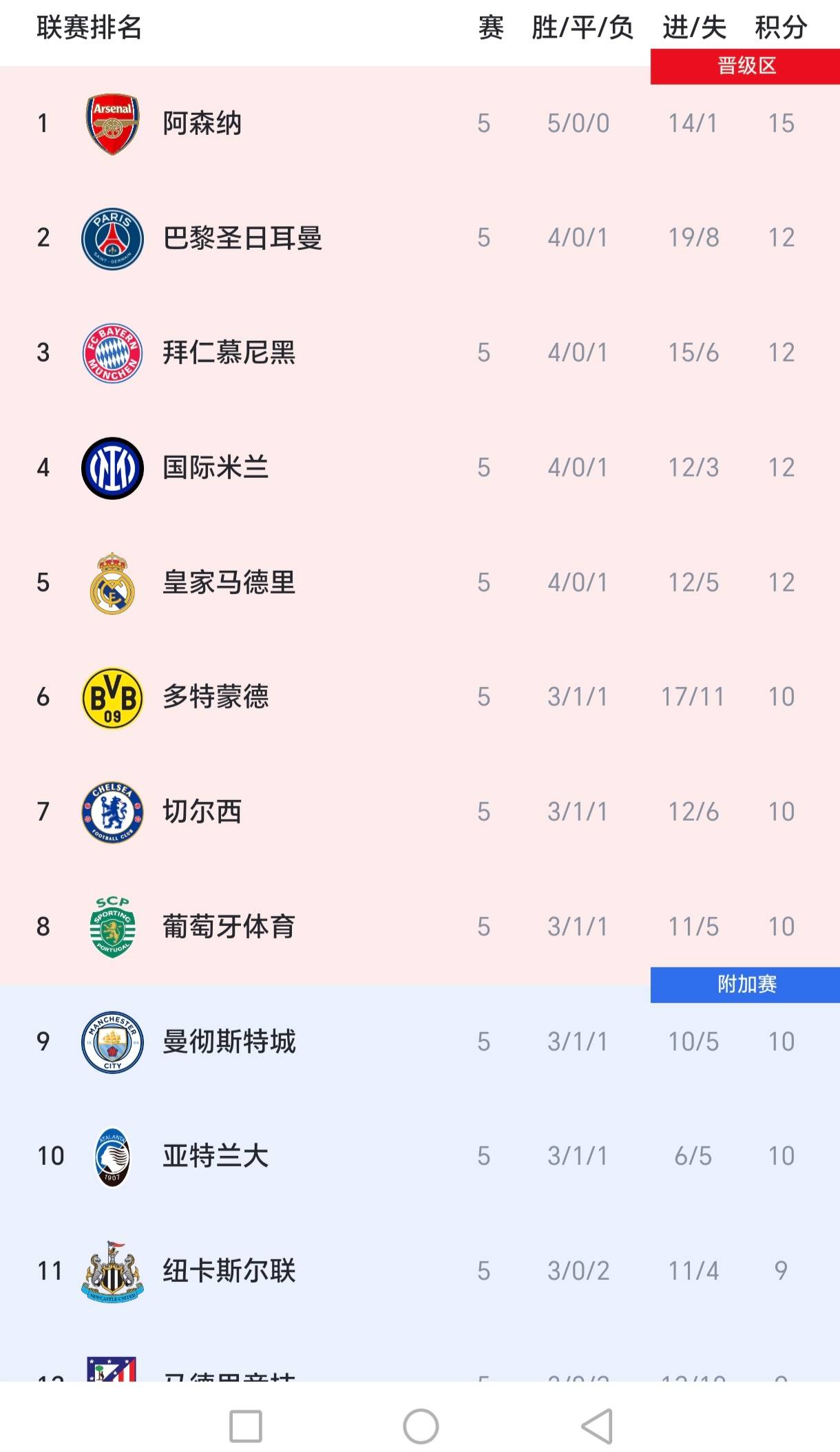 อาร์เซนอลชนะทั้งห้าเกมของพวกเขา ขณะที่บาเยิร์น มิวนิคและอินเตอร์ มิลานพ่ายแพ้ในแชมเปียนส์ลีกเป็นครั้งแรก อาร์เซนอลครองตำแหน่งจ่าฝูงด้วย 15 คะแนน