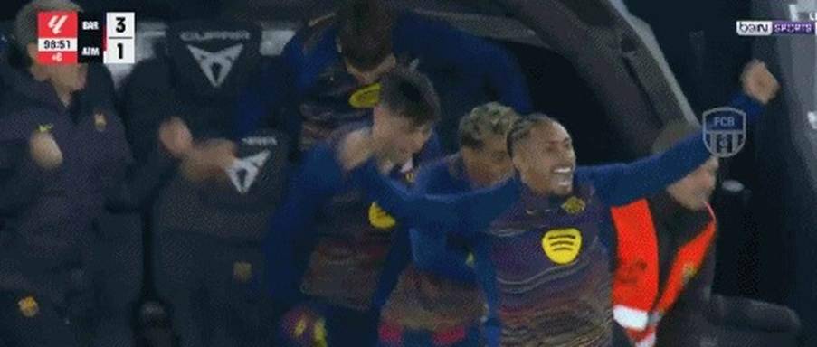 ขณะที่ราฟินญ่าเลี้ยงบอลหลบโอบลัคเข้าไปยิงเข้าประตูที่ว่างเปล่าและหันไปจูบตราสโมสรบาร์เซโลนา เสียงเชียร์จากคัมป์นูแทบจะทะลุหลังคา