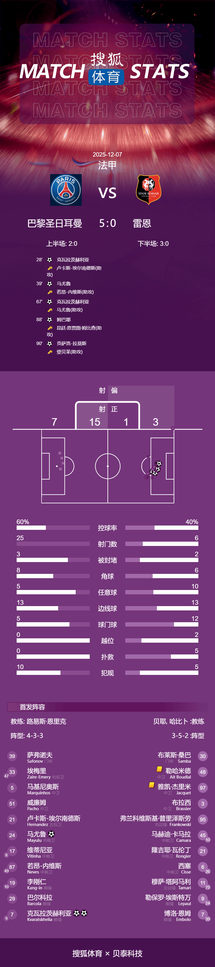 เวลา 04:05 น. ตามเวลาปักกิ่ง วันที่ 7 ธันวาคม การแข่งขันลีกเอิง ฤดูกาล 2025-26 นัดที่ 15 ยังคงดำเนินต่อไป โดยแชมป์เก่า ปารีส แซงต์-แชร์กแมง เอาชนะทีมเยือน 10 คนอย่างแรนส์ 5-0 ที่สนามปาร์ก เดส์ แพร็งซ์ระหว่างการแข่งขัน มายูลูทำประตูได้หนึ่งลูกและแอสซิสต์หนึ่งครั้ง, ควาราตสเคเลียทำประตูสองลูก, ขณะที่เอ็มบายและรามอสทำประตูได้คนละหนึ่งลูก. กองหลังของเรนส์ จาคเกต์ถูกไล่ออกจากสนาม. จากผลการแข่งขันนี้ ปารีส แซงต์-แชร์กแมง ยังคงอยู่ในอันดับที่สอง ตามหลังผู้นำลีกอย่างเลนส์อยู่หนึ่งคะแนน.