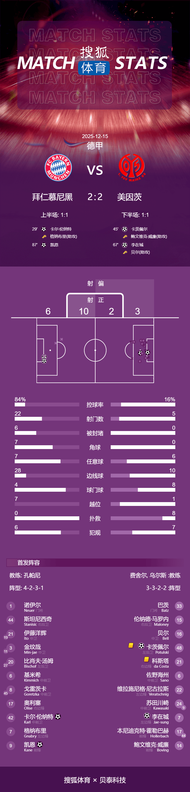 เวลา 00:30 น. ตามเวลาปักกิ่ง วันที่ 15 ธันวาคม บาเยิร์น มิวนิค เปิดบ้านรับการมาเยือนของไมนซ์ ในรอบที่ 14 ของบุนเดสลีกาในครึ่งแรก คาร์ล ดาวรุ่งวัย 17 ปีของบาเยิร์นเป็นผู้เปิดสกอร์ก่อน ก่อนที่โคซโลว์สกี้จะตีเสมอ ครึ่งแรกจบลงด้วยสกอร์ 1-1 ระหว่างบาเยิร์นกับไมนซ์ หลังจากพักครึ่ง ลี แจ-ซองทำประตูให้ไมนซ์ขึ้นนำ แต่เคนก็มาตีเสมอได้จากจุดโทษ จบเกมเสมอกัน 2-2 ทำให้บาเยิร์นนำเป็นจ่าฝูงบุนเดสลีกาต่อไปด้วยคะแนนนำ 9 แต้ม