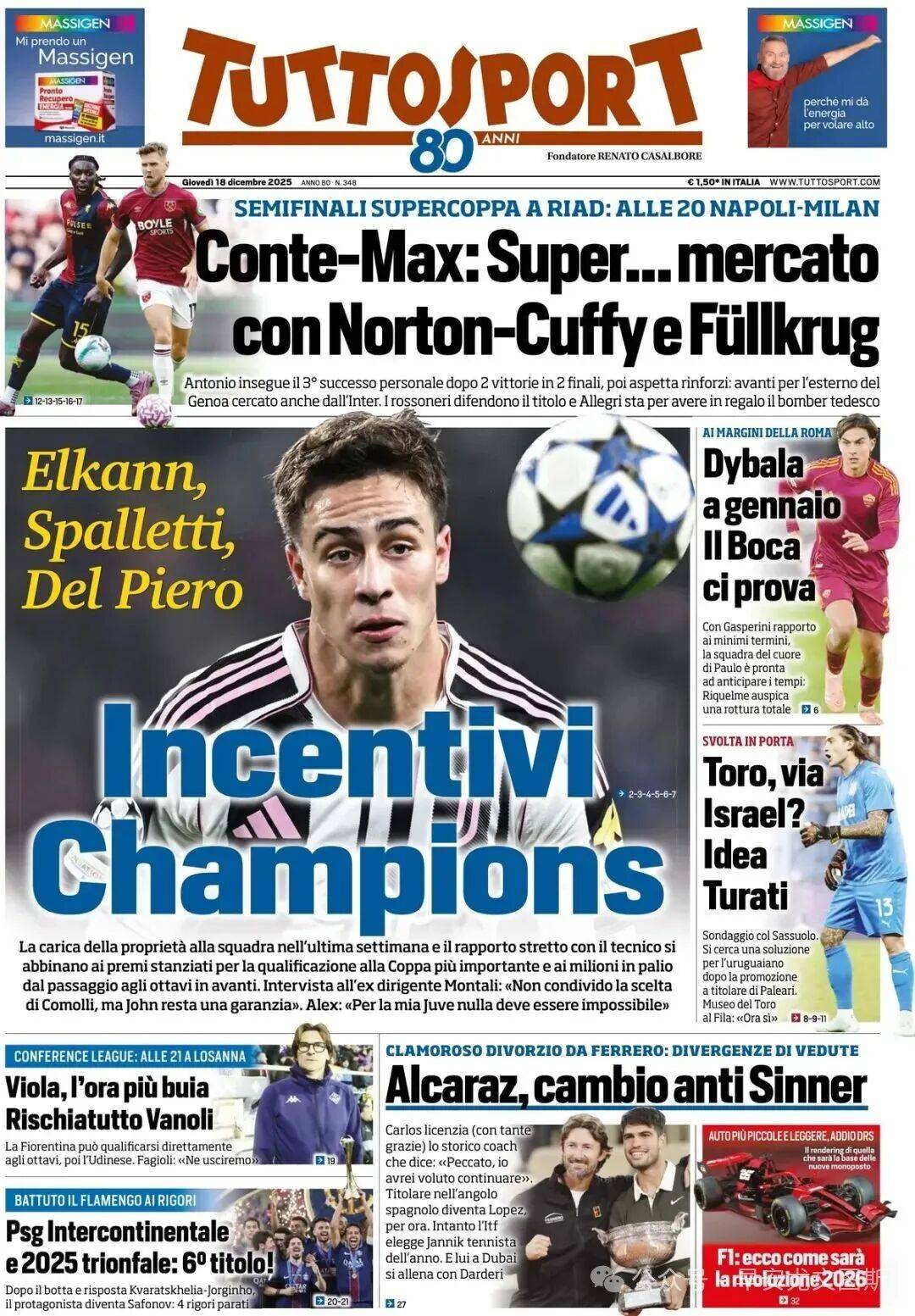 1. การแสดงต่อหน้าชีคแห่งอาระเบีย: ซูเปอร์คัพอิตาลี รอบรองชนะเลิศนัดแรก คืนนี้ที่ริยาด นาโปลี พบ เอซี มิลาน คอนเต้หวังคว้าแชมป์สมัยที่ 10 อัลเลกรีไล่ล่าแชมป์ที่ 15 ฮอยจ์ลุนด์เผชิญหน้ากับพูลิซิชโลบอตก้าเริ่มเกม, โปลิตาโน่ประจำการในตำแหน่งแบ็คขวา, ดิ ลอเรนโซ่เสริมแนวรับ, โดยมีเอลมาสมีแนวโน้มจะได้ลงตัวจริงมากกว่าบิรัง. นคุนคูยืนยันว่าฟิลครูเกอร์ใกล้จะมาถึง. หากการแข่งขันจบลงด้วยผลเสมอ จะมีการดวลจุดโทษทันที.