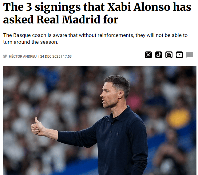 แม้จะมีเสียงเรียกร้องจากภายนอกให้ "เสริมทัพทันที" แต่ผู้บริหารของเรอัล มาดริดก็ได้แสดงจุดยืนอย่างชัดเจนมาหลายเดือนแล้วว่าจะไม่ใช้เงินแม้แต่บาทเดียวในตลาดซื้อขายนักเตะช่วงฤดูหนาวที่กำลังจะมาถึง ตามรายงานของสื่อสเปน Fichaje ผู้จัดการทีม อลอนโซ่ เข้าใจจุดยืนของสโมสร แต่ก็ยังได้จัดทำรายชื่อนักเตะที่ต้องการย้ายทีมซึ่งมีเพียงสามชื่อเท่านั้นวางไว้บนโต๊ะของผู้อำนวยการกีฬา นี่ไม่ใช่คำขาด แต่เป็น "แผนงานสำหรับการเซ็นสัญญาในอนาคต"