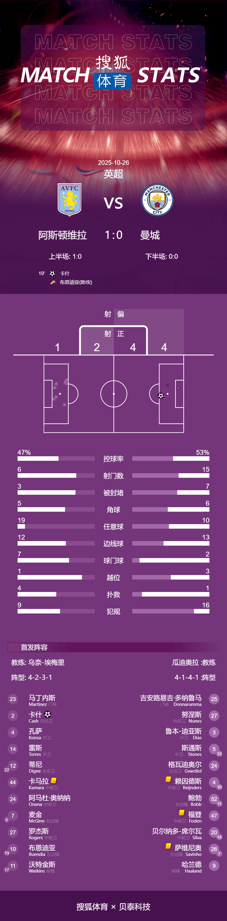 เวลา 22:00 น. ของวันที่ 26 ตุลาคม 2025 การแข่งขันรอบที่เก้าของฤดูกาลพรีเมียร์ลีก 2025-2026 มีการแข่งขันสำคัญเมื่อแมนเชสเตอร์ ซิตี้ เดินทางไปพบกับแอสตัน วิลล่า ในครึ่งแรก บุเอนเดียทำแอสซิสต์ให้แคชยิงประตูเข้าไปในช่วงเวลาสุดท้ายของครึ่งหลัง มาร์มูชจ่ายบอลให้ฮาแลนด์ทำประตู แต่การพยายามทำประตูถูกตัดสินว่าล้ำหน้าจากมาร์มูช ในที่สุด แมนเชสเตอร์ ซิตี้ พ่ายแพ้ 0-1 ในการแข่งขันนอกบ้านกับแอสตัน วิลล่า ทำให้พวกเขาหยุดสถิติชนะติดต่อกันสามนัด นอกจากนี้ พวกเขายังหลุดจากอันดับสี่ในตารางลีก โดยตามหลังผู้นำอย่างอาร์เซนอลอยู่หกคะแนน