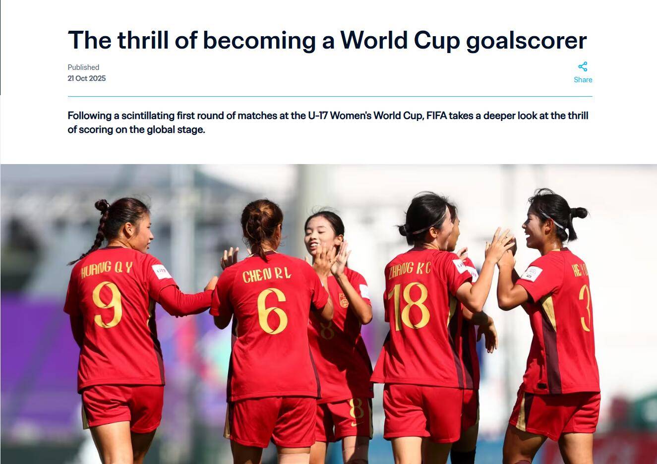 บทความของฟีฟ่าชื่นชมทีมฟุตบอลหญิง U17 ของจีนสำหรับประตูที่น่าทึ่ง; ภาพฉลองชัยชนะขึ้นปก _นักฟุตบอล_ _ฟุตบอลโลก_ _ความปีติยินดี_