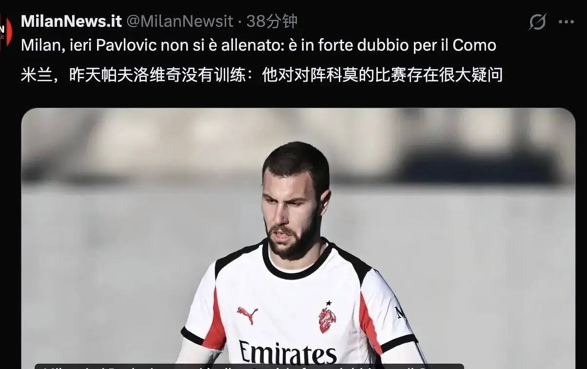 สื่ออิตาลีรายงานว่า: ปาฟโลวิชต้องเย็บแผลถึงเก้าเข็มและมีแนวโน้มสูงที่จะพลาดการลงสนามในเกมระหว่างมิลานกับโคโม